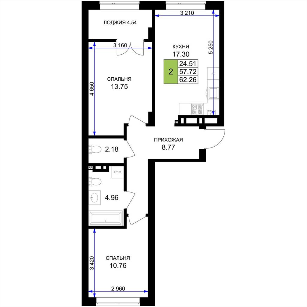 общая 62,26 м2, жилая 24,51 м2, кухни 17,3 м2 |