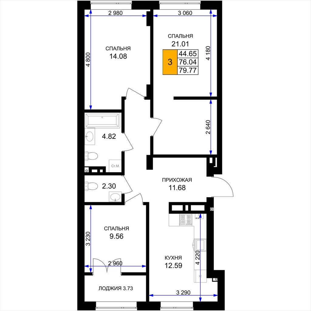 общая 79,77 м2, жилая 44,65 м2, кухни 12,59 м2 |
