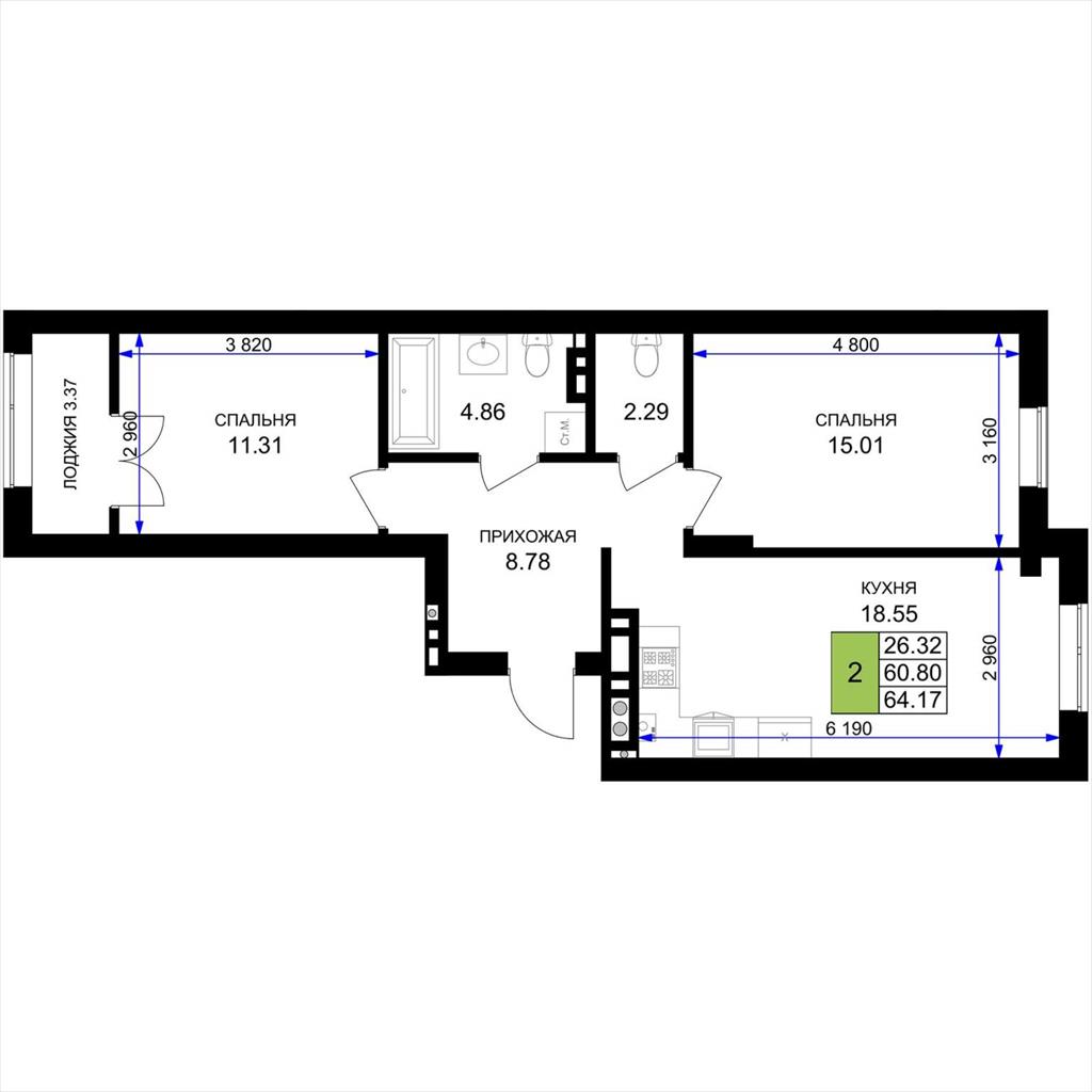 общая 64,17 м2, жилая 26,32 м2, кухни 18,55 м2 |