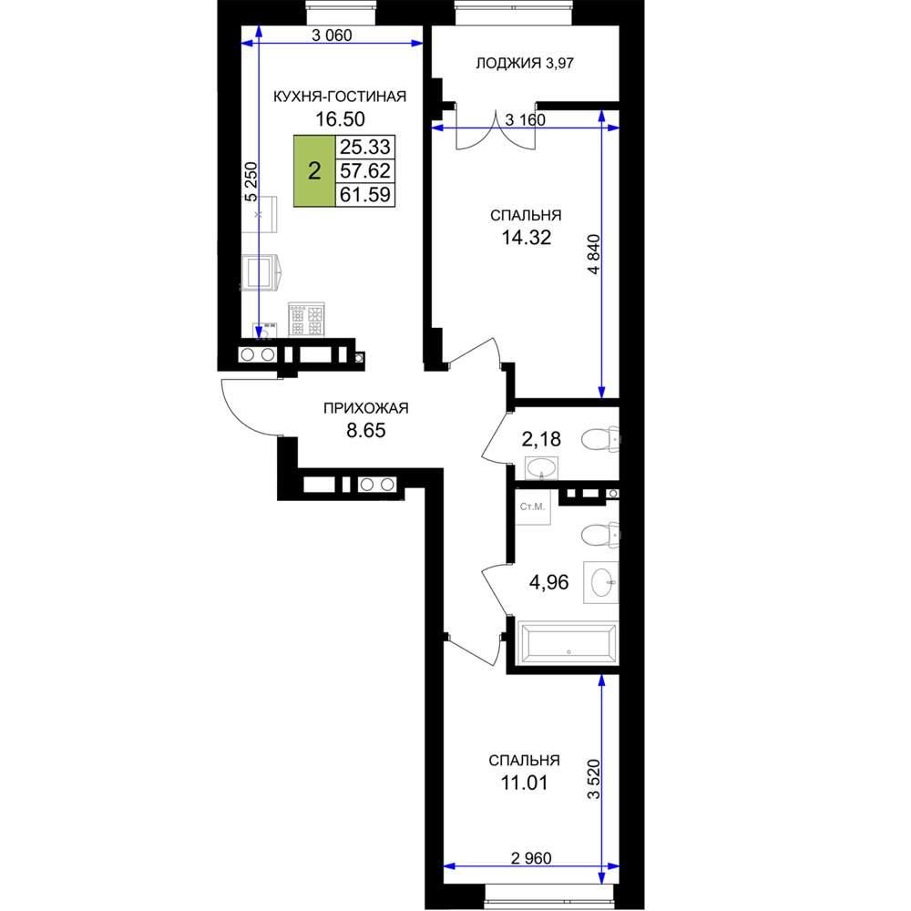 общая 61,59 м2, жилая 25,33 м2, кухни 16,5 м2 |