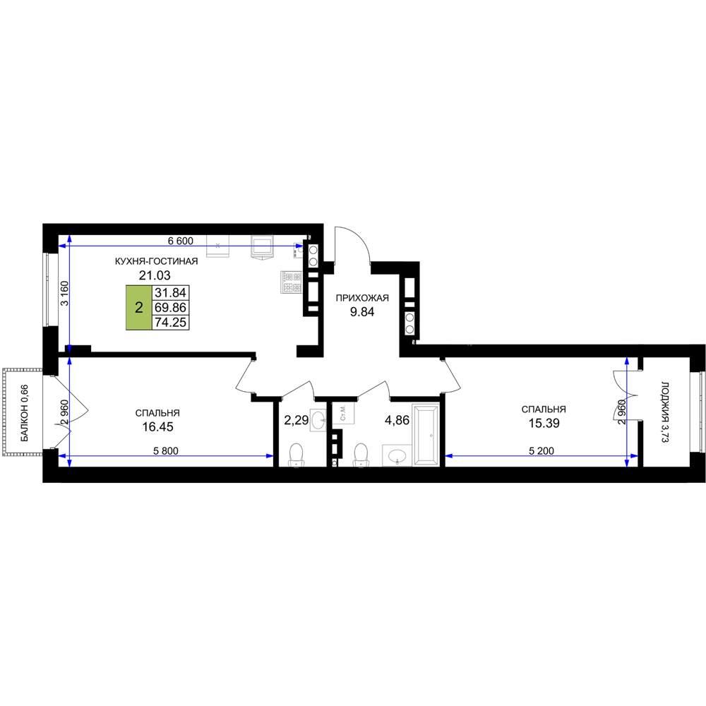 общая 74,25 м2, жилая 31,84 м2, кухни 21,03 м2 |