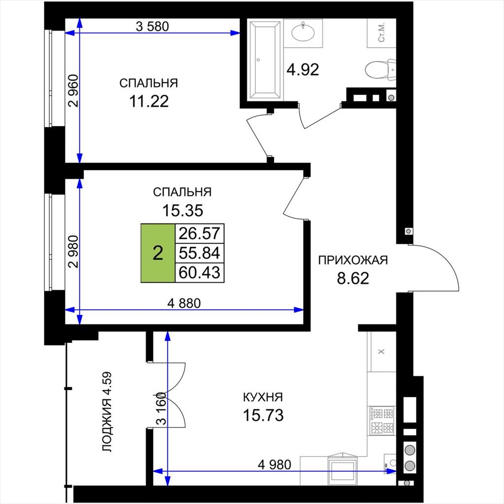 общая 60,43 м2, жилая 26,57 м2, кухни 15,73 м2 |