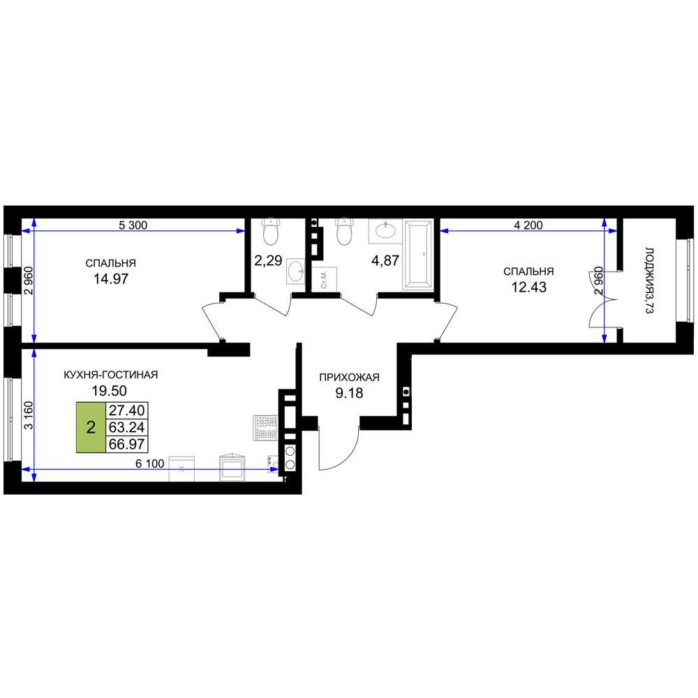 общая 66,97 м2, жилая 27,4 м2, кухни 19,5 м2 |
