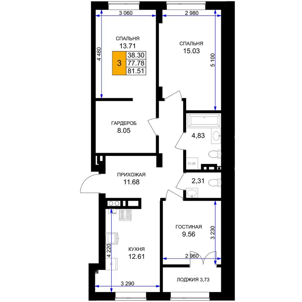общая 81,51 м2, жилая 38,3 м2, кухни 12,61 м2 |