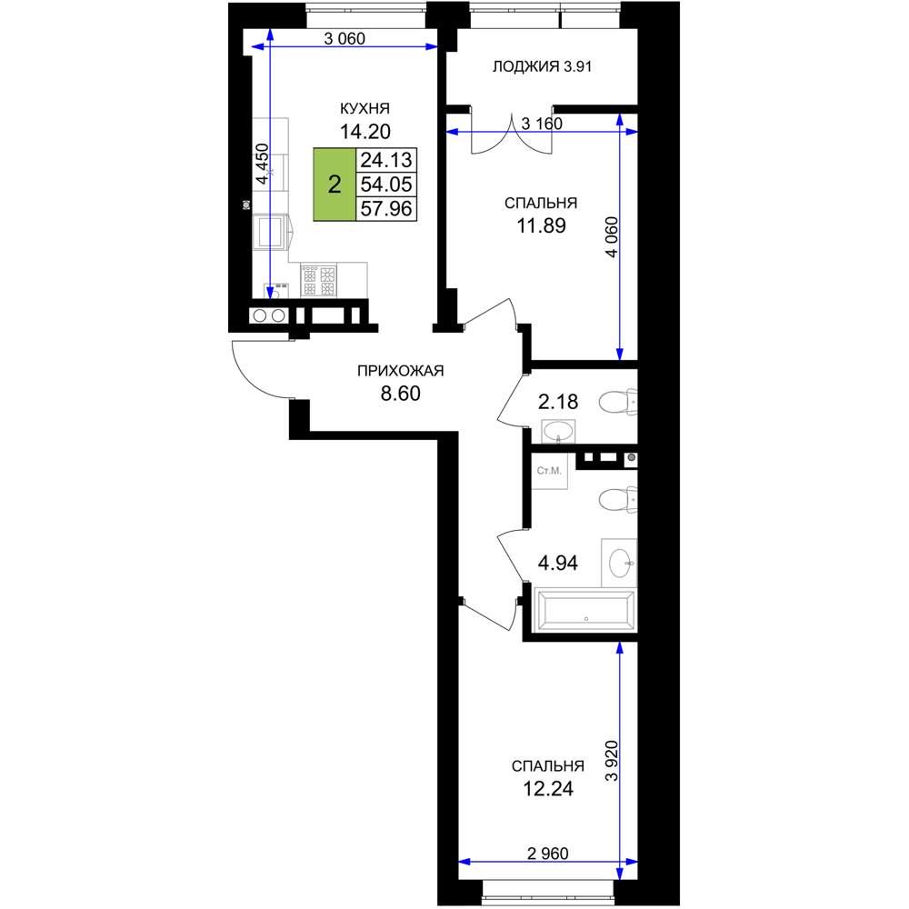 общая 57,96 м2, жилая 24,13 м2, кухни 14,2 м2 |
