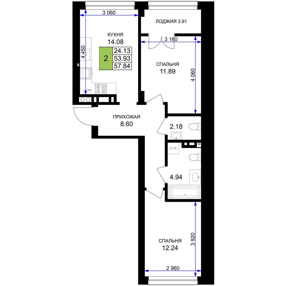 общая 57,84 м2, жилая 24,13 м2, кухни 14,08 м2 |