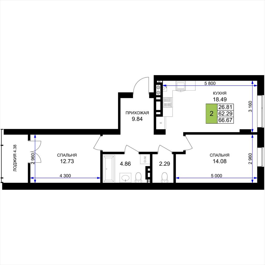 общая 66,67 м2, жилая 26,81 м2, кухни 18,49 м2 |