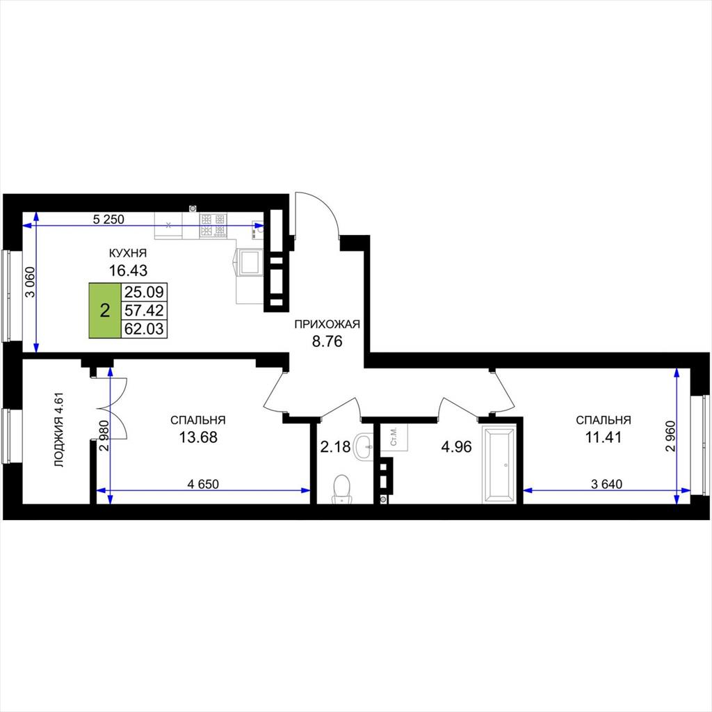 общая 62,03 м2, жилая 25,09 м2, кухни 16,43 м2 |