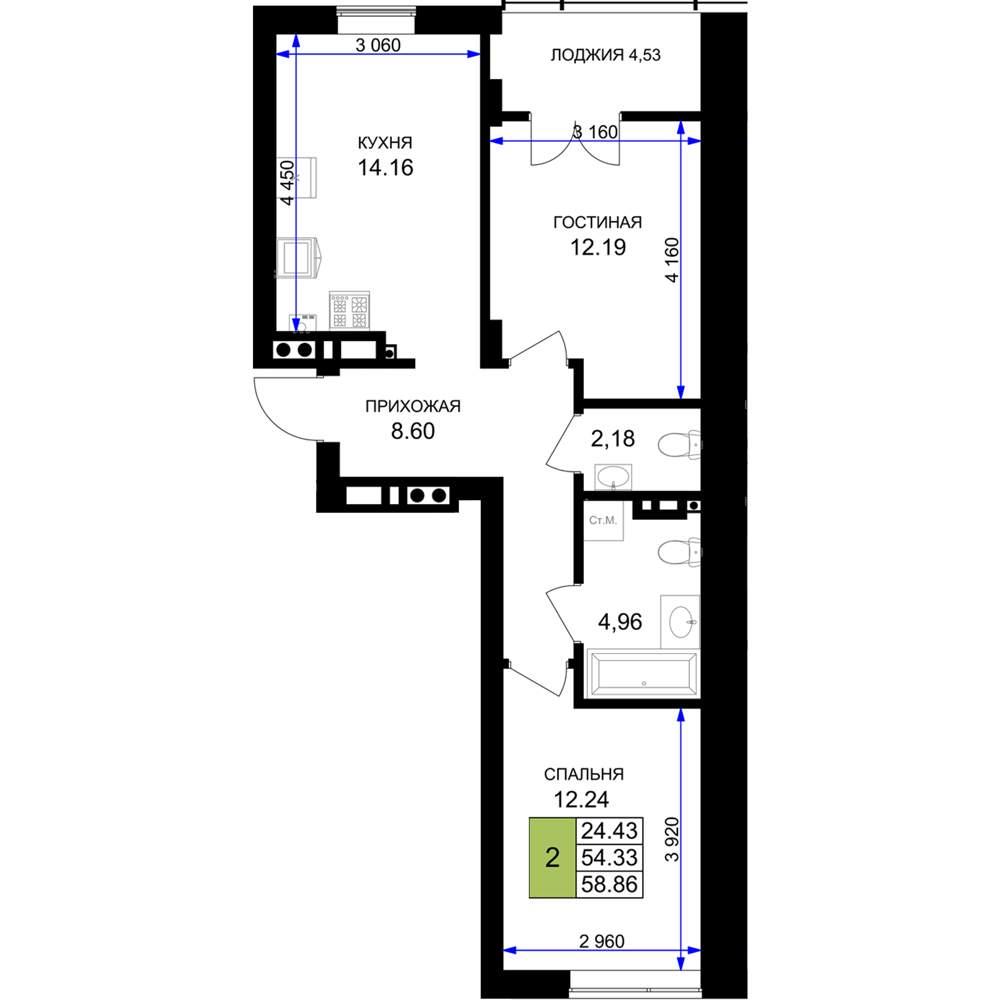 общая 58,86 м2, жилая 24,43 м2, кухни 14,16 м2 |