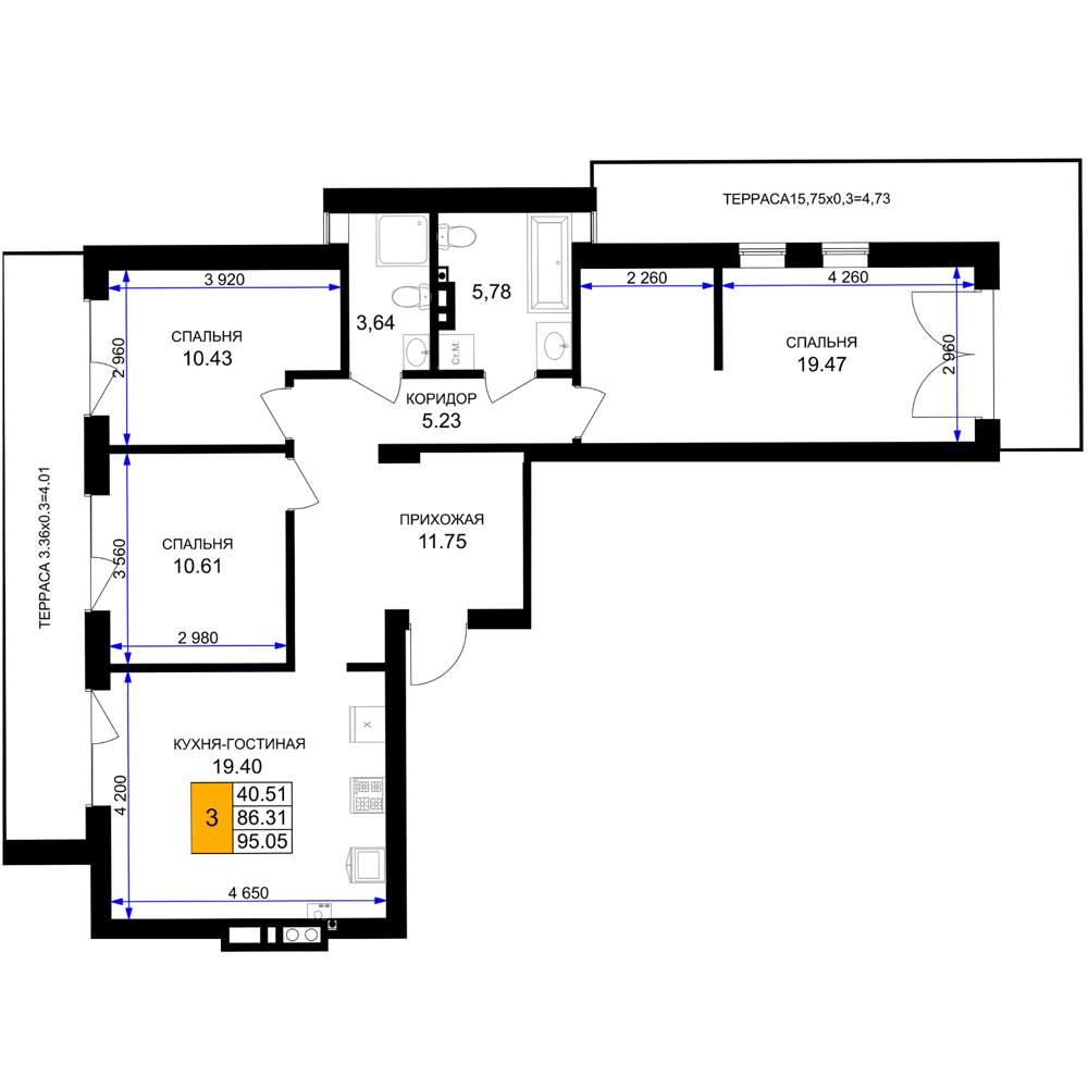 общая 95,05 м2, жилая 40,51 м2, кухни 19,4 м2 |