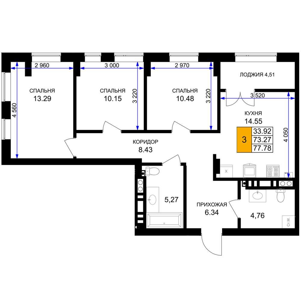 общая 77,78 м2, жилая 33,92 м2, кухни 14,55 м2 |