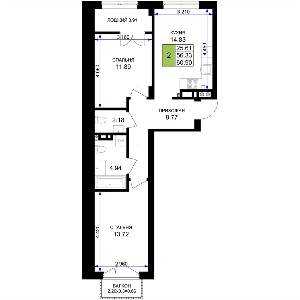 общая 60,9 м2, жилая 25,61 м2, кухни 14,83 м2 |