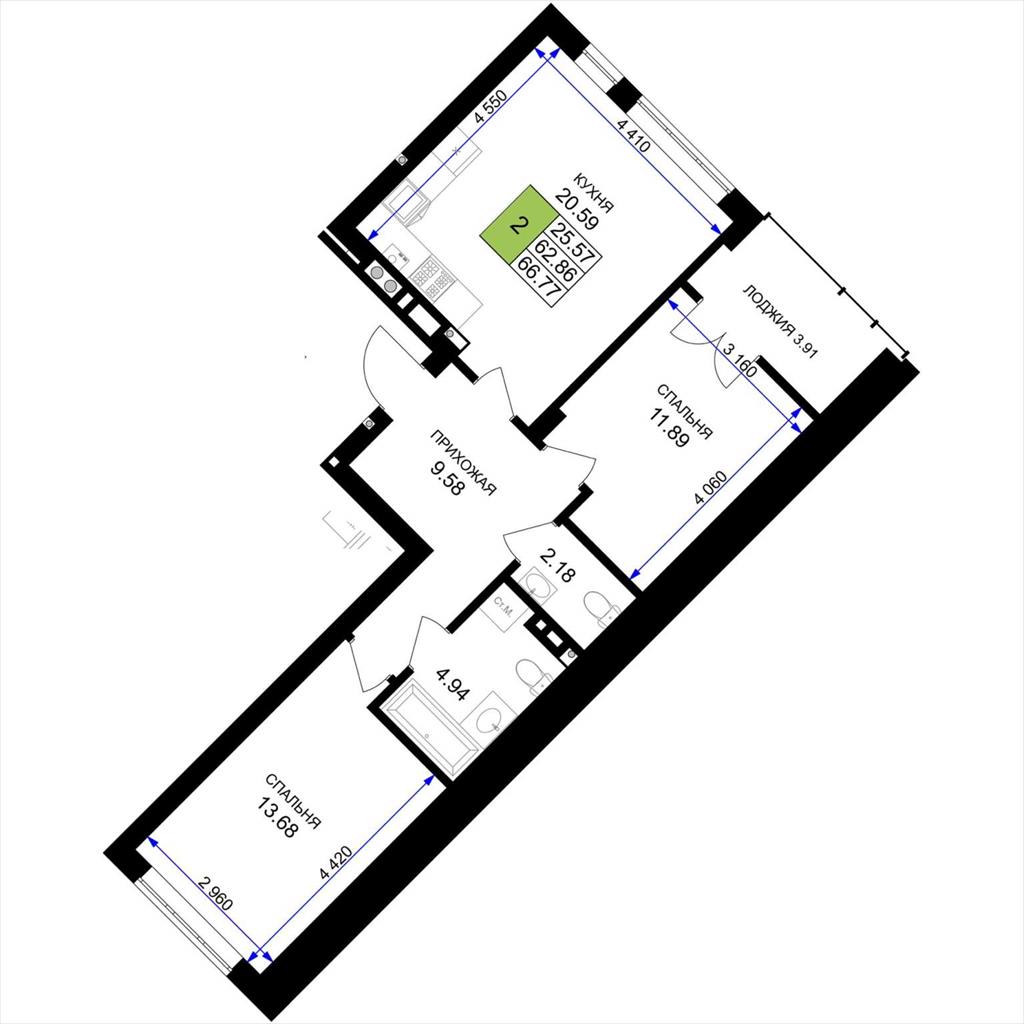 общая 66,77 м2, жилая 25,57 м2, кухни 20,59 м2 |