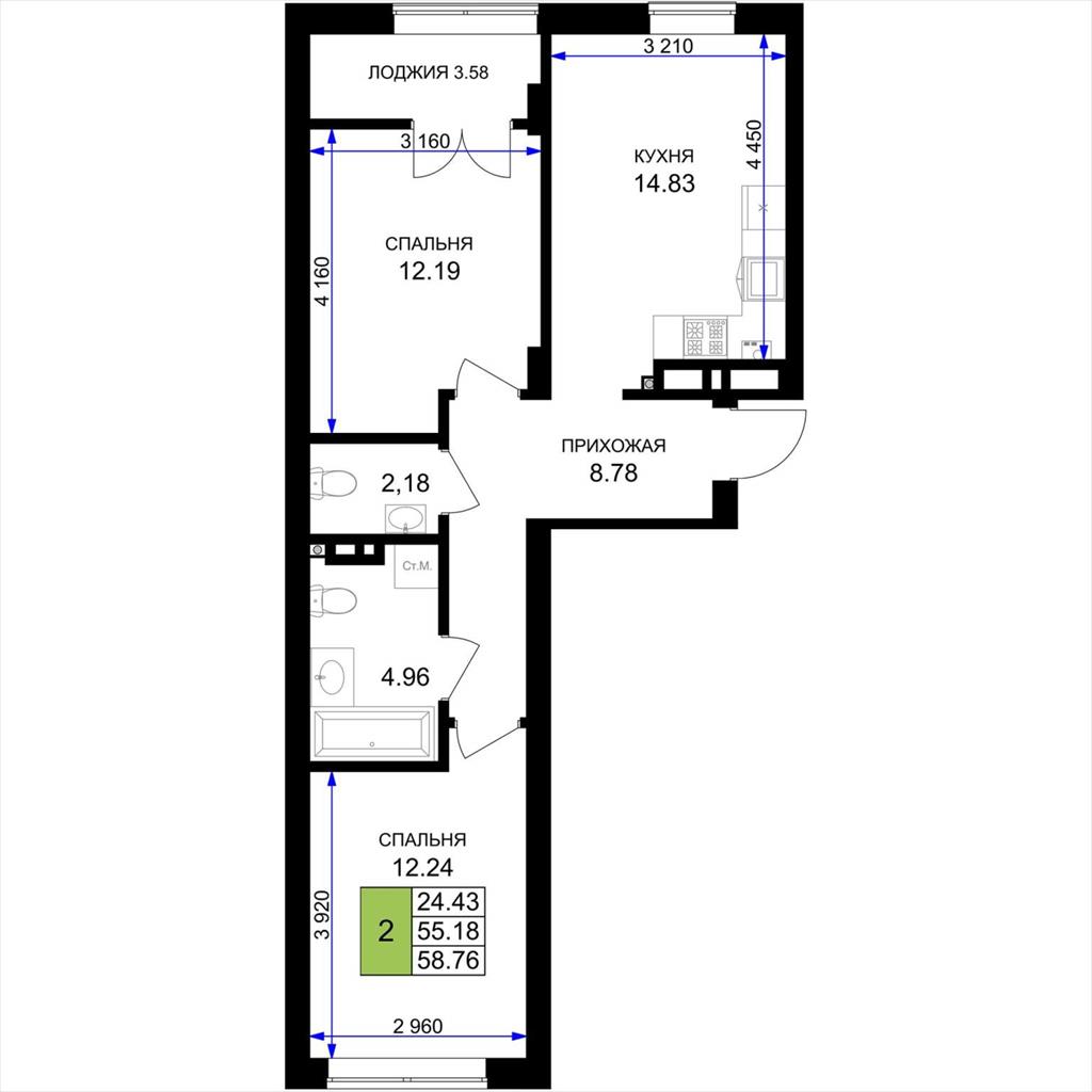 общая 58,76 м2, жилая 24,43 м2, кухни 14,83 м2 |
