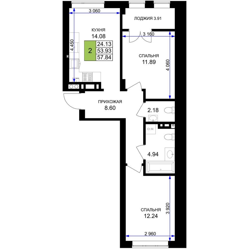 общая 57,84 м2, жилая 24,13 м2, кухни 14,08 м2 |