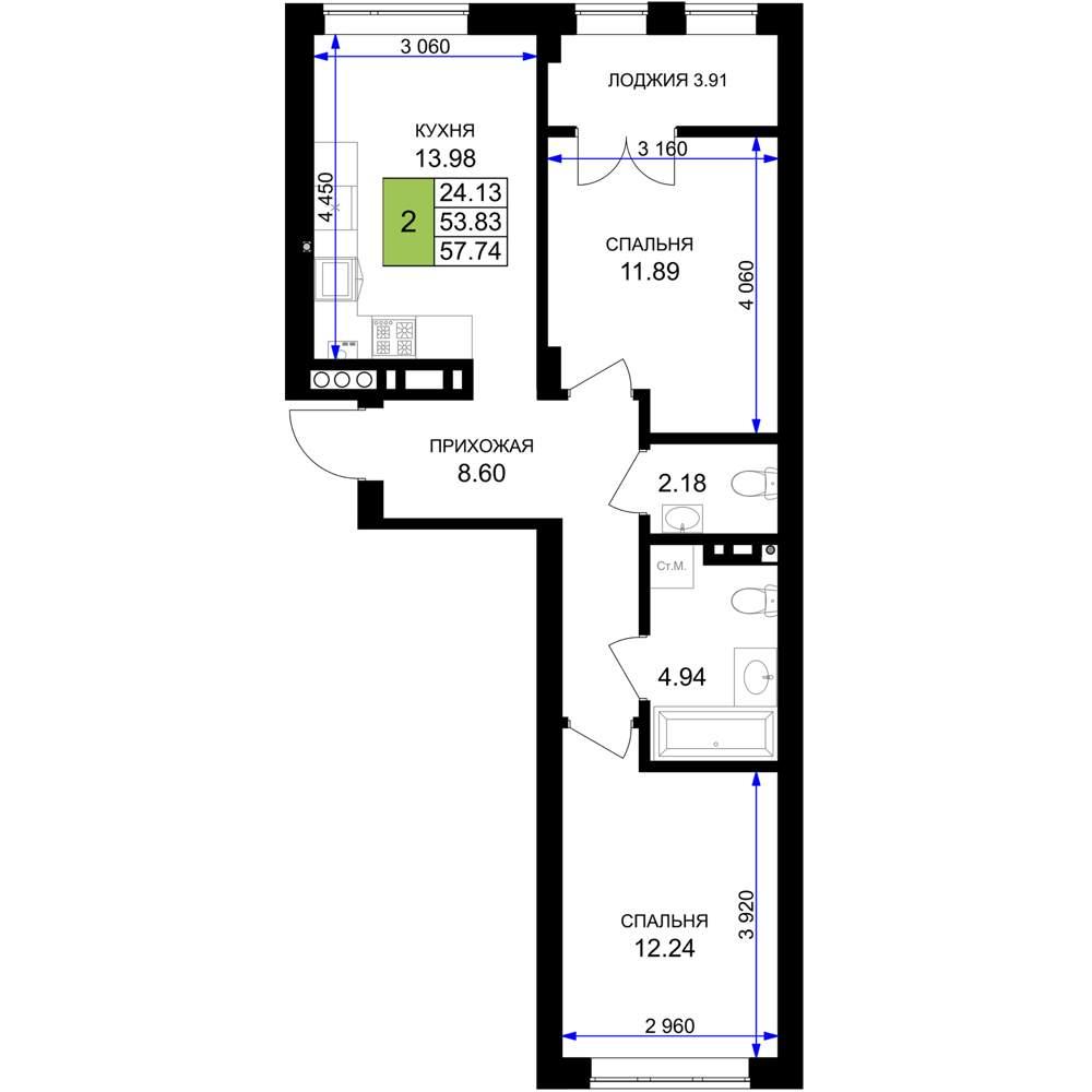 общая 57,74 м2, жилая 24,13 м2, кухни 13,98 м2 |