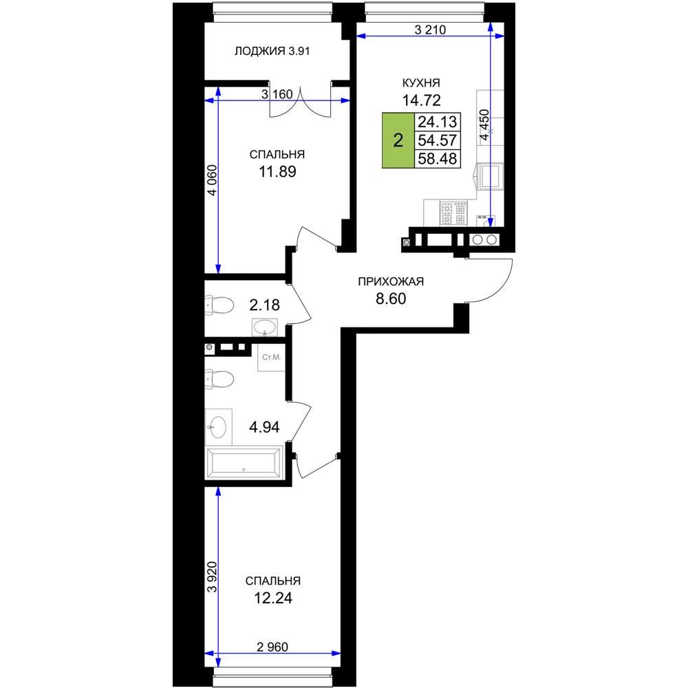 общая 58,48 м2, жилая 24,13 м2, кухни 14,72 м2 |