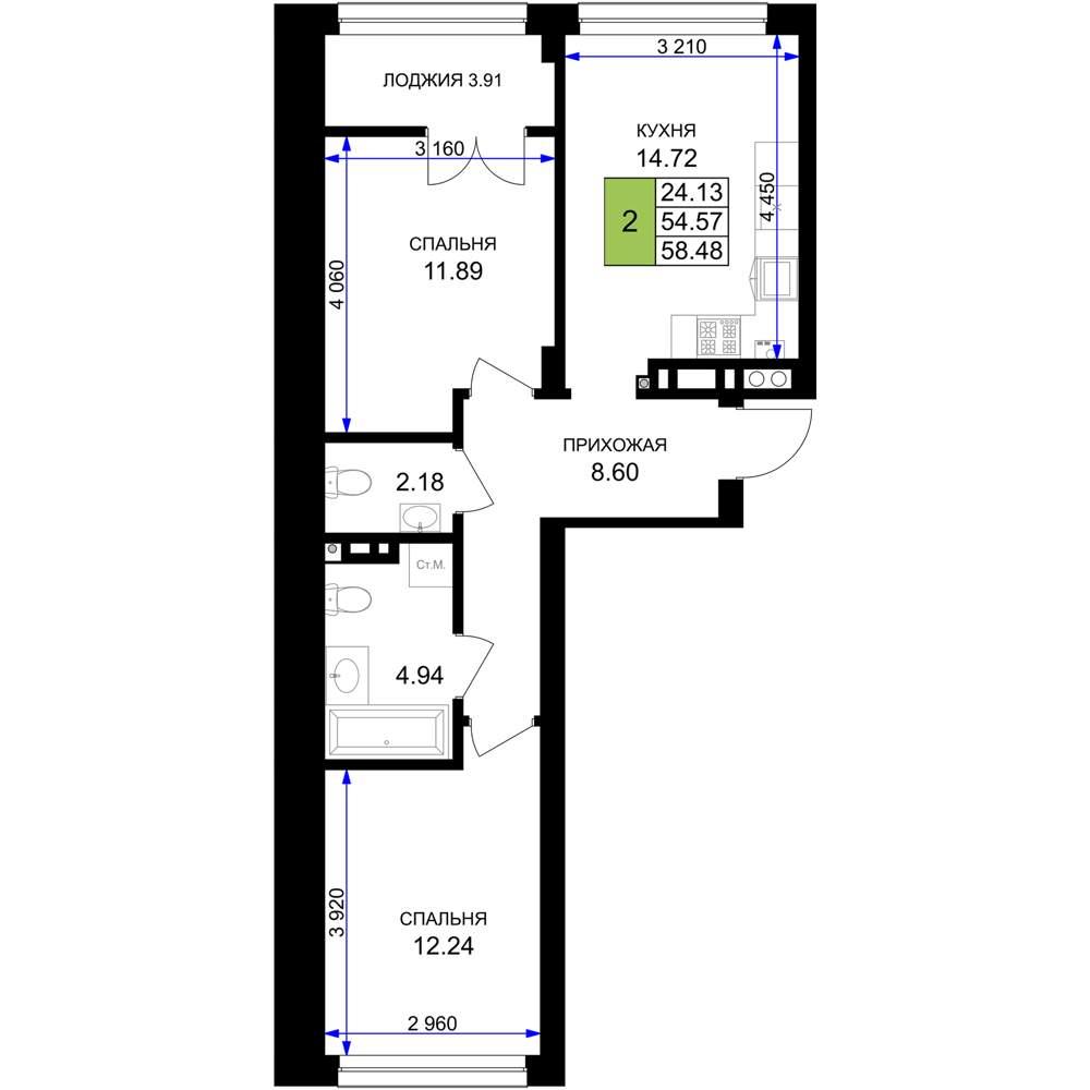 общая 58,48 м2, жилая 24,13 м2, кухни 14,72 м2 |