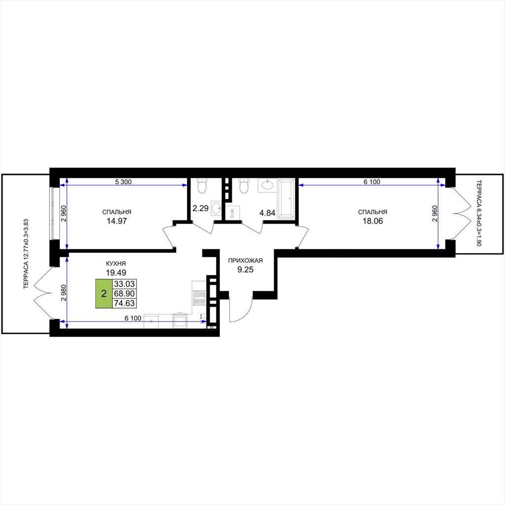общая 74,63 м2, жилая 33,03 м2, кухни 19,49 м2 |