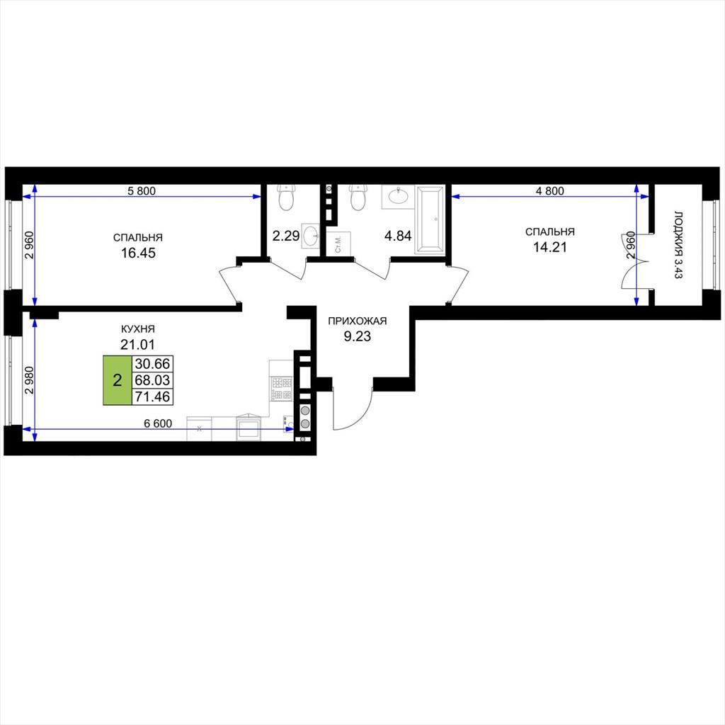 общая 71,46 м2, жилая 30,66 м2, кухни 21,01 м2 |