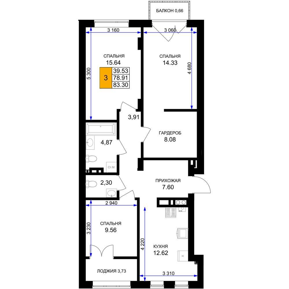 общая 83,3 м2, жилая 39,53 м2, кухни 12,62 м2 |