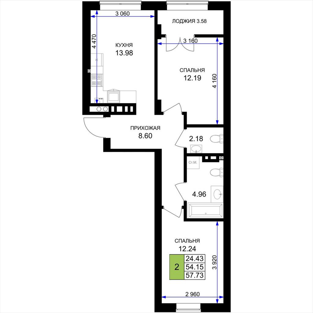 общая 57,73 м2, жилая 24,43 м2, кухни 13,98 м2 |