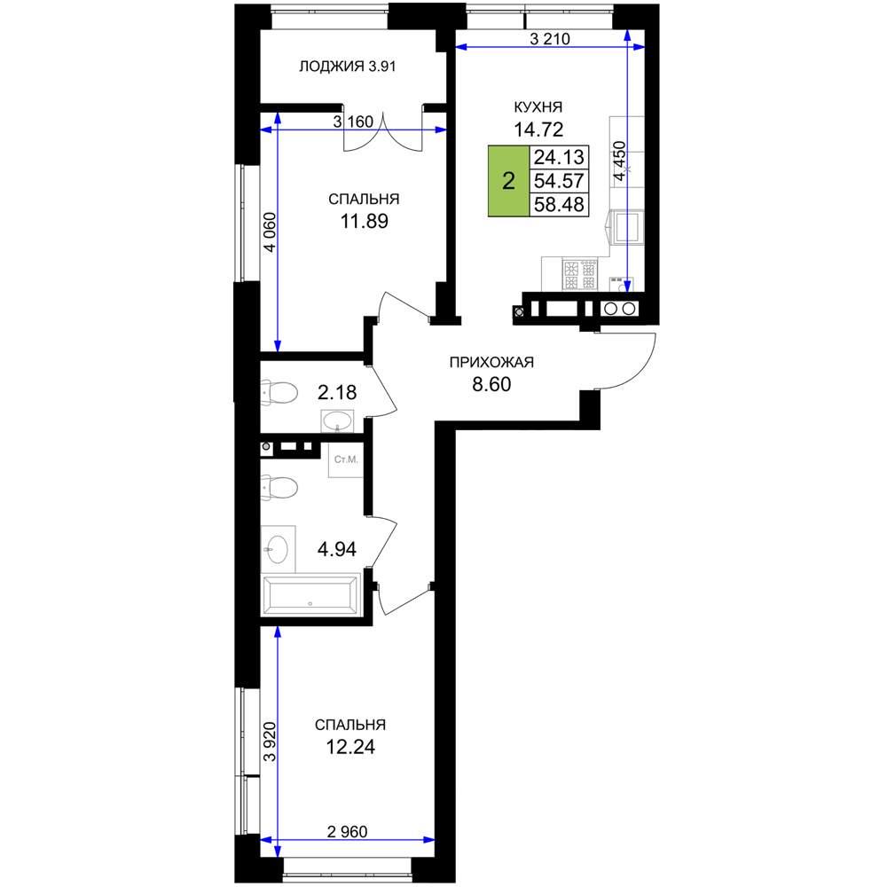 общая 58,48 м2, жилая 24,13 м2, кухни 14,72 м2 |