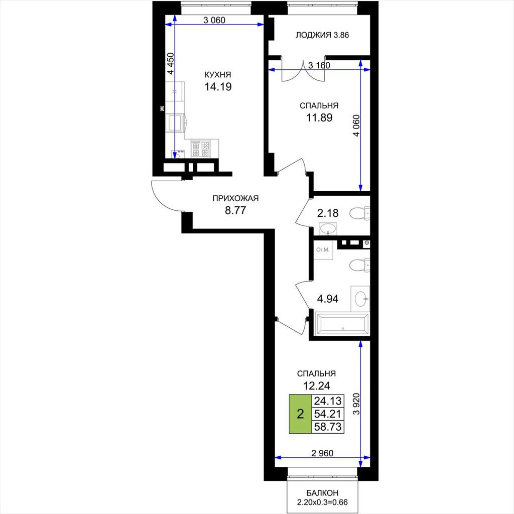 общая 58,73 м2, жилая 24,13 м2, кухни 14,19 м2 |