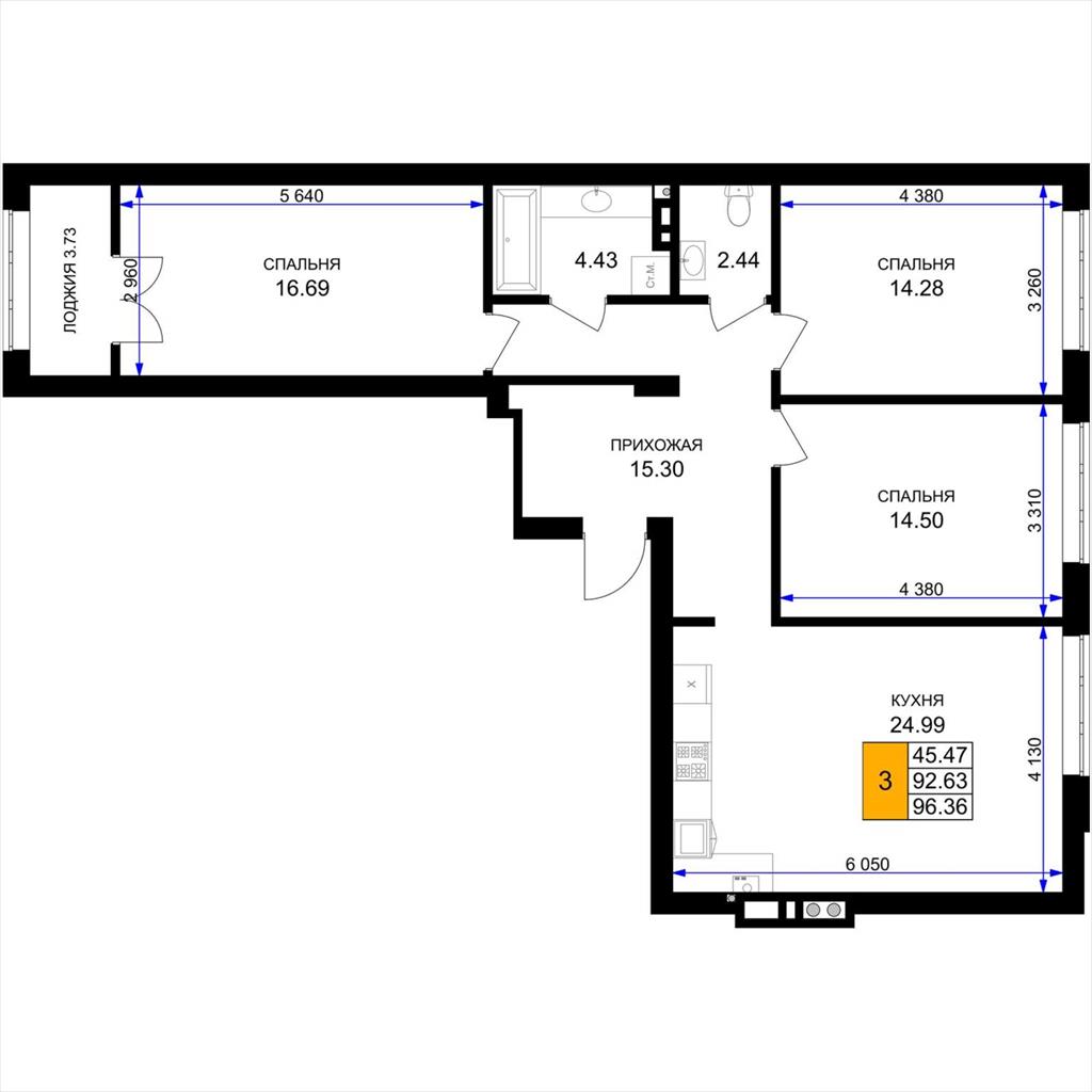 общая 96,36 м2, жилая 45,47 м2, кухни 24,99 м2 |