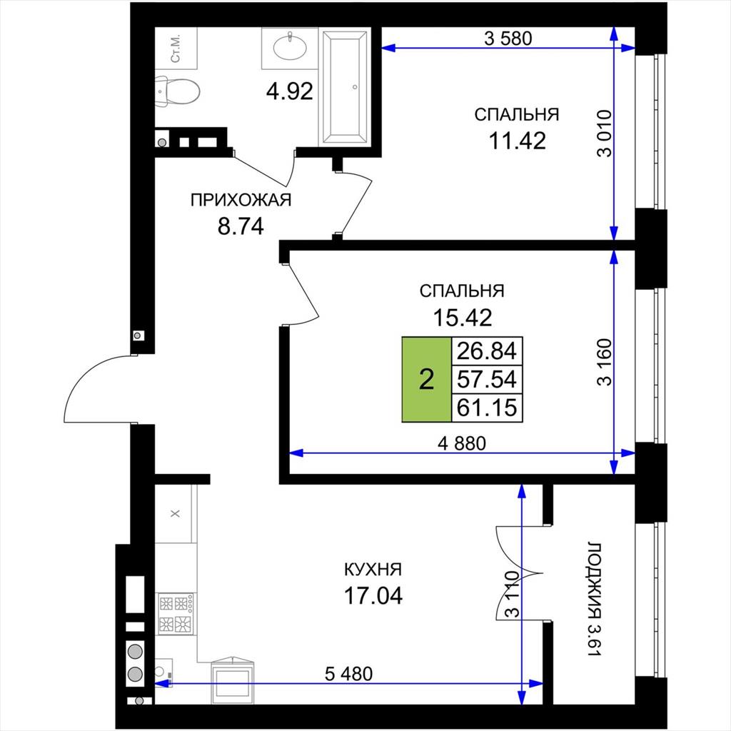 общая 61,15 м2, жилая 26,84 м2, кухни 17,04 м2 |