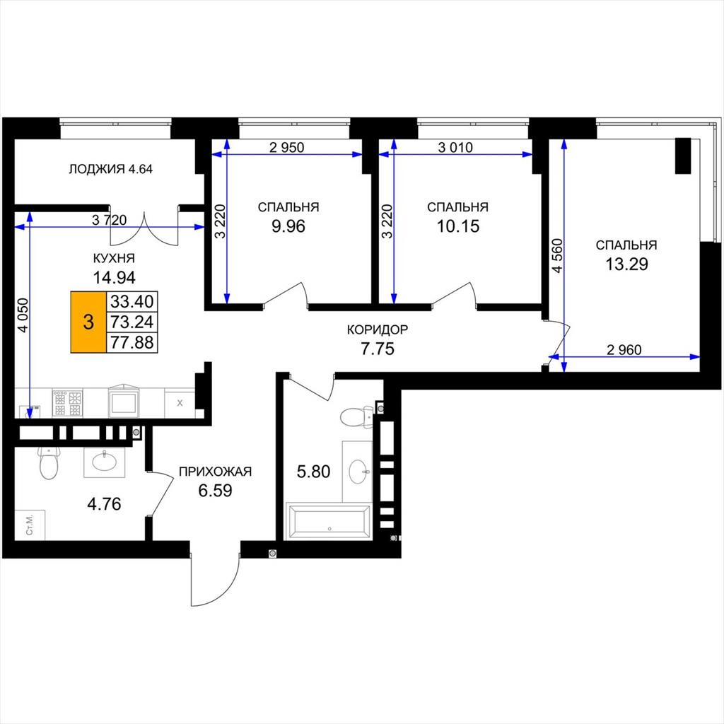 общая 77,88 м2, жилая 33,4 м2, кухни 14,94 м2 |