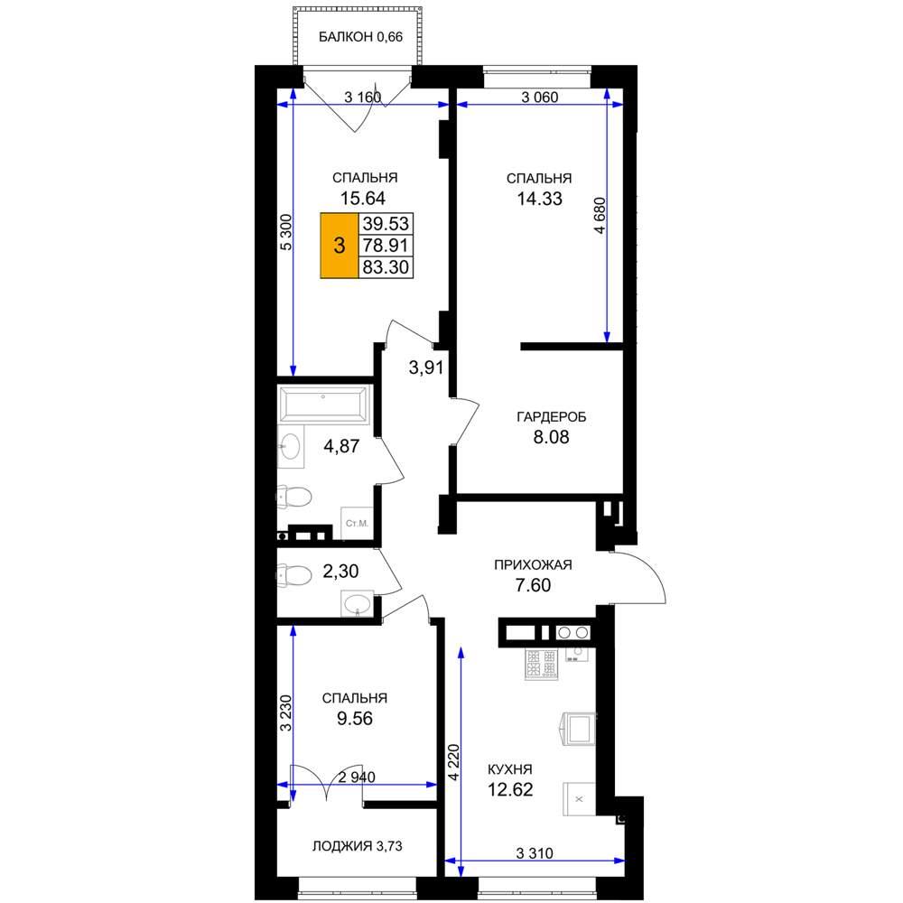 общая 83,3 м2, жилая 39,53 м2, кухни 12,62 м2 |