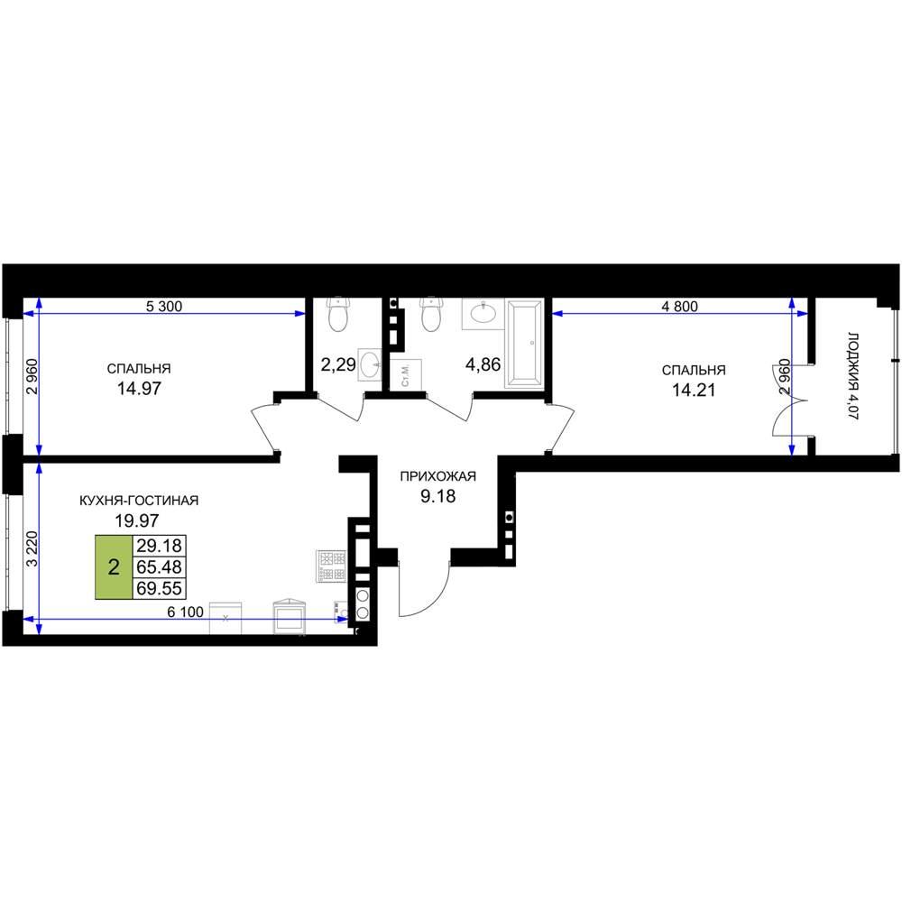 общая 69,55 м2, жилая 29,18 м2, кухни 19,97 м2 |