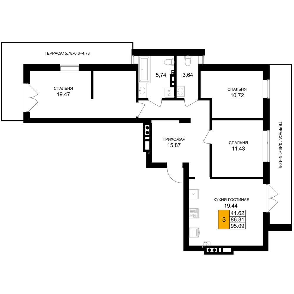 общая 95,09 м2, жилая 41,62 м2, кухни 19,44 м2 |