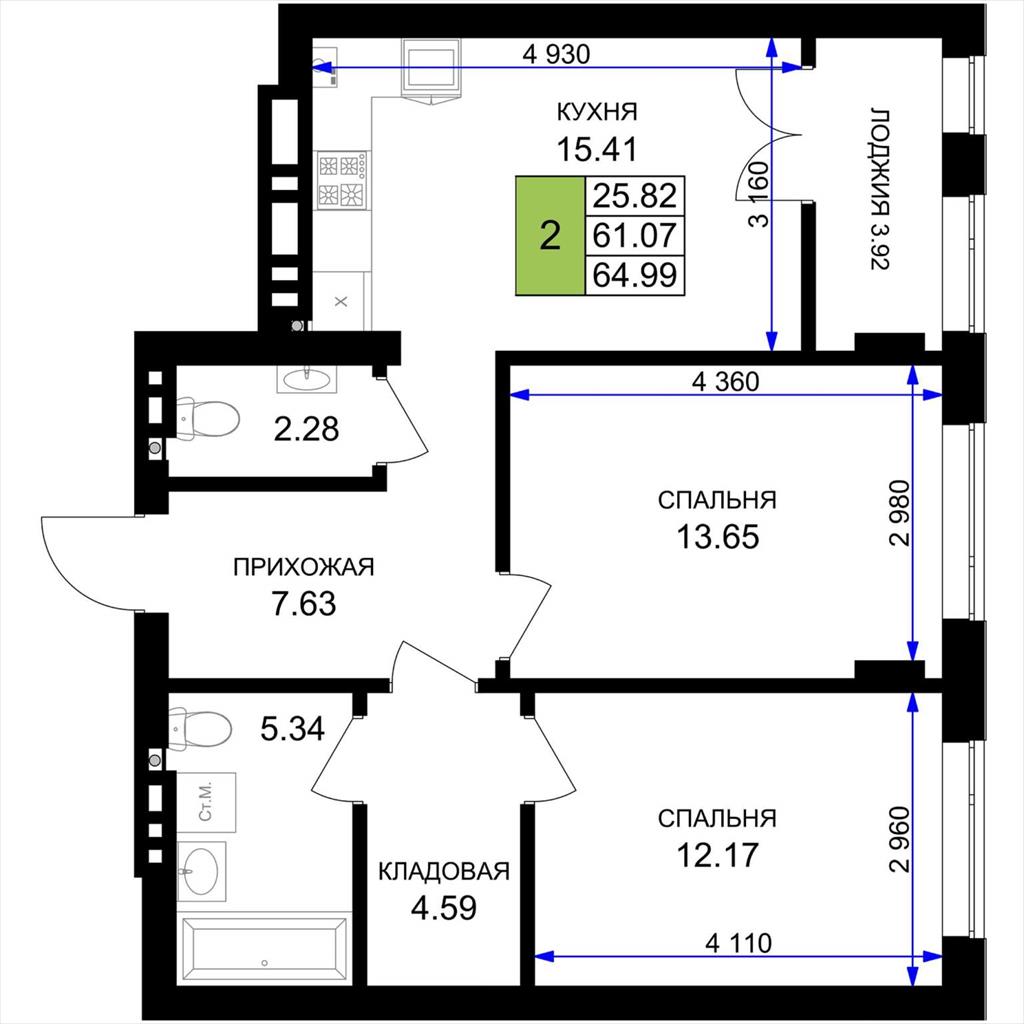 общая 64,99 м2, жилая 25,82 м2, кухни 15,41 м2 |