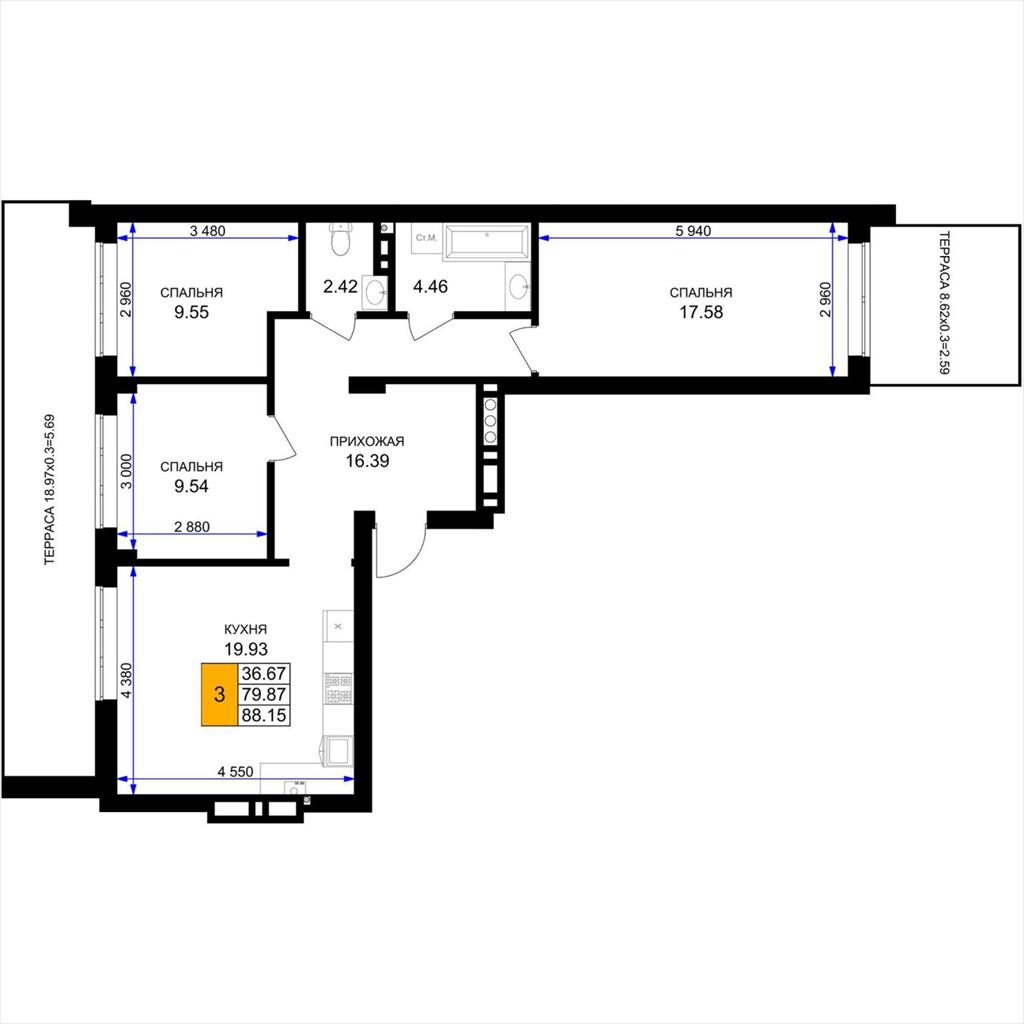общая 88,15 м2, жилая 36,67 м2, кухни 19,93 м2 |