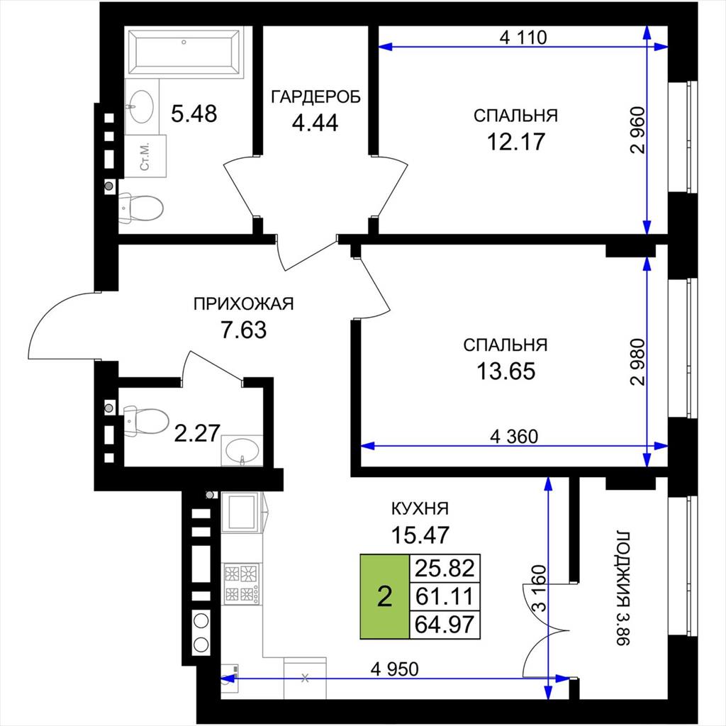 общая 64,97 м2, жилая 25,82 м2, кухни 15,47 м2 |