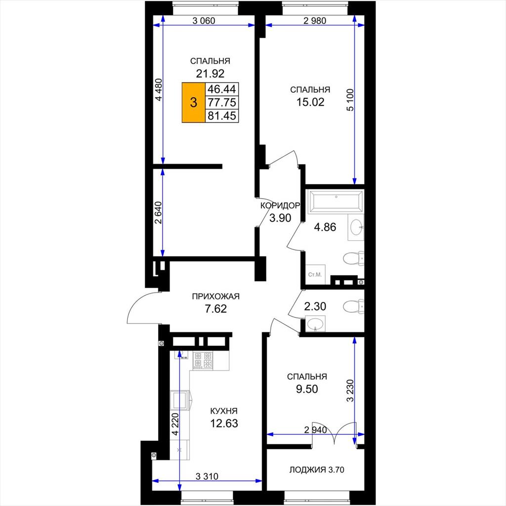 общая 81,45 м2, жилая 46,44 м2, кухни 12,63 м2 |