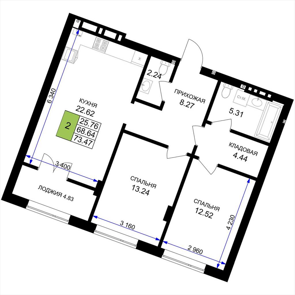 общая 73,47 м2, жилая 25,76 м2, кухни 22,62 м2 |