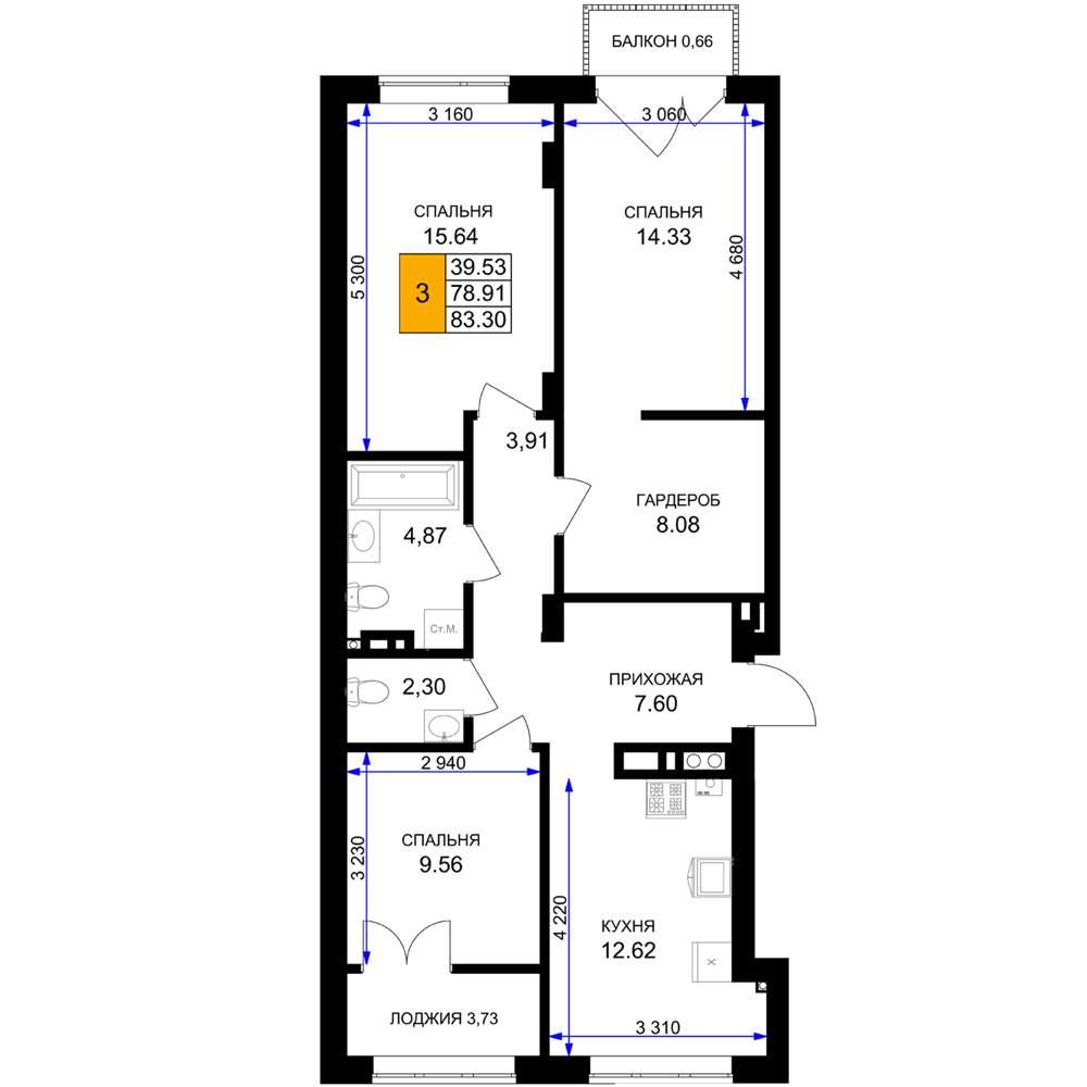 общая 83,3 м2, жилая 39,53 м2, кухни 12,62 м2 |