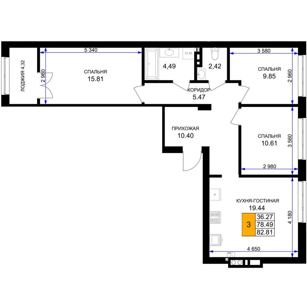 общая 82,81 м2, жилая 36,27 м2, кухни 19,44 м2 |