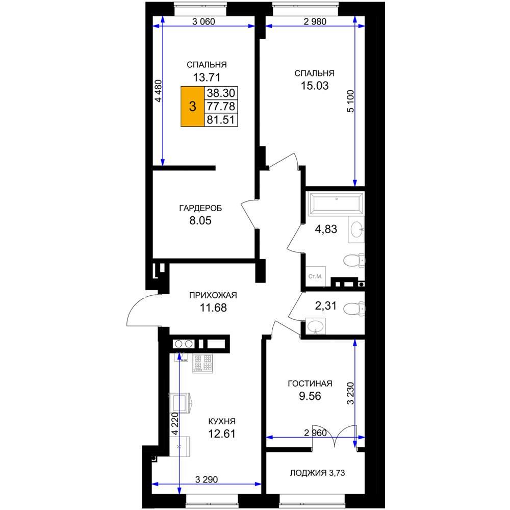 общая 81,51 м2, жилая 38,3 м2, кухни 12,61 м2 |