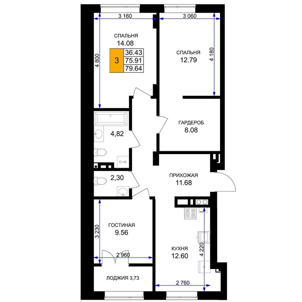 общая 79,64 м2, жилая 36,43 м2, кухни 12,6 м2 |