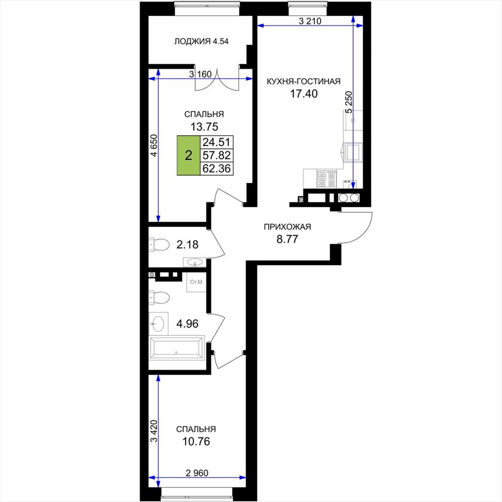 общая 62,36 м2, жилая 24,51 м2, кухни 17,4 м2 |