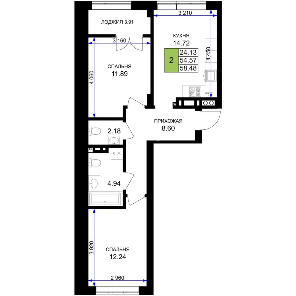 общая 58,48 м2, жилая 24,13 м2, кухни 14,72 м2 |