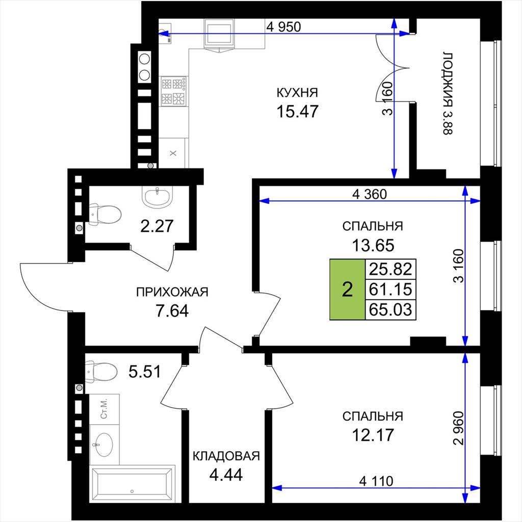 общая 65,03 м2, жилая 25,82 м2, кухни 15,47 м2 |