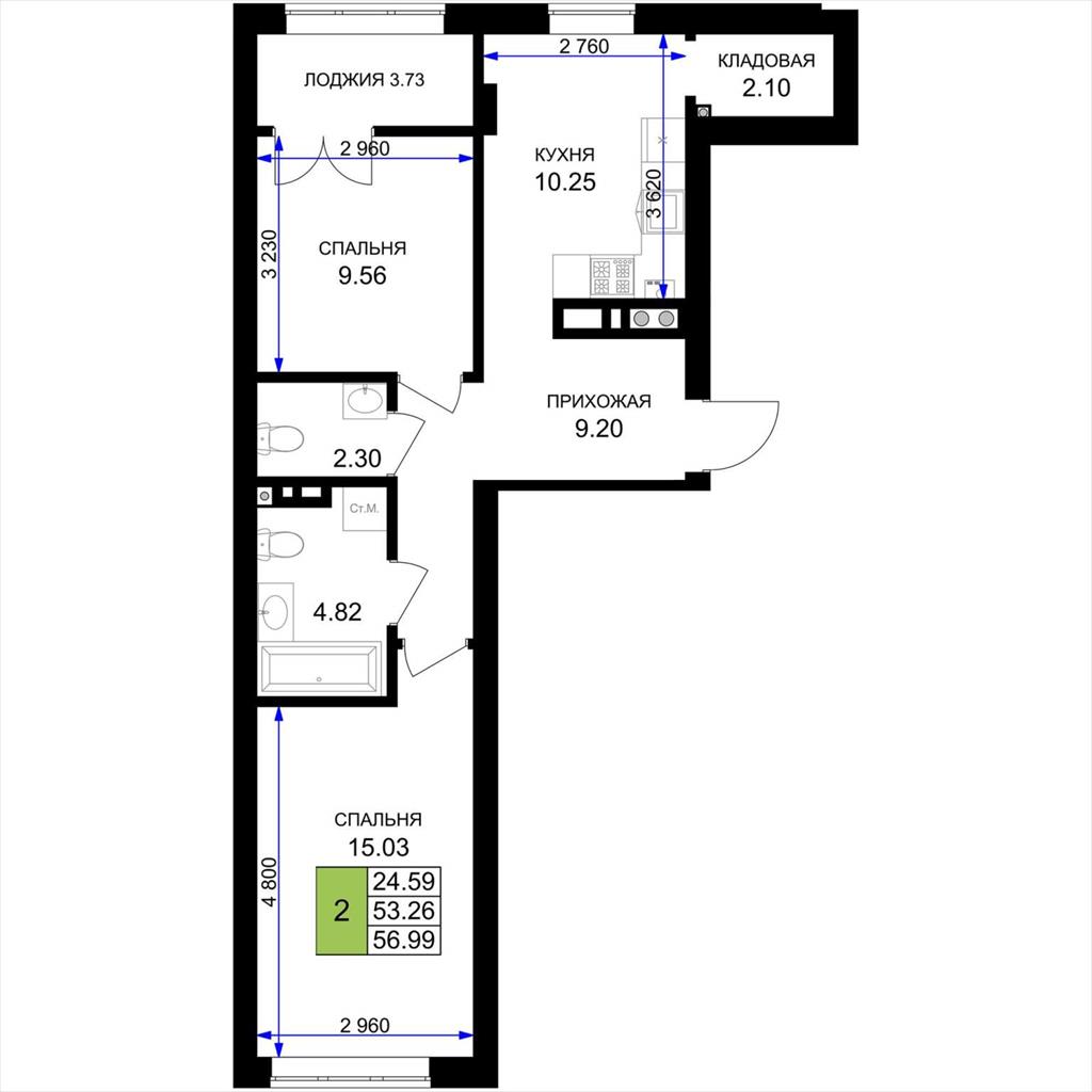 общая 56,99 м2, жилая 24,59 м2, кухни 10,25 м2 |