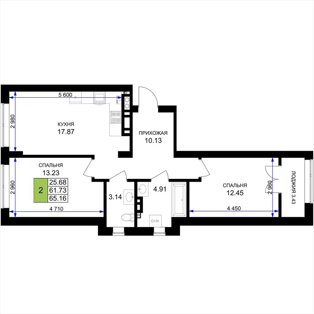 общая 65,16 м2, жилая 25,68 м2, кухни 17,87 м2 |