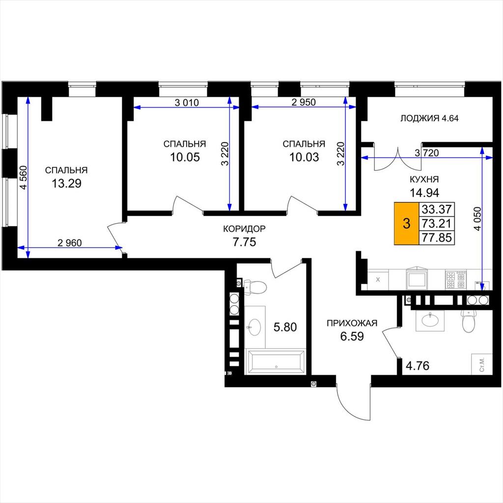 общая 77,85 м2, жилая 33,37 м2, кухни 14,94 м2 |