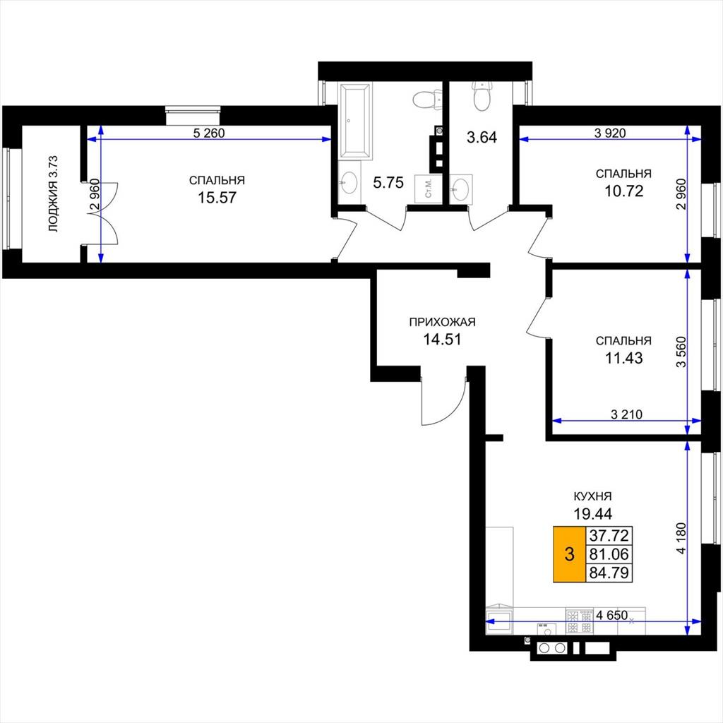 общая 84,79 м2, жилая 37,72 м2, кухни 19,44 м2 |